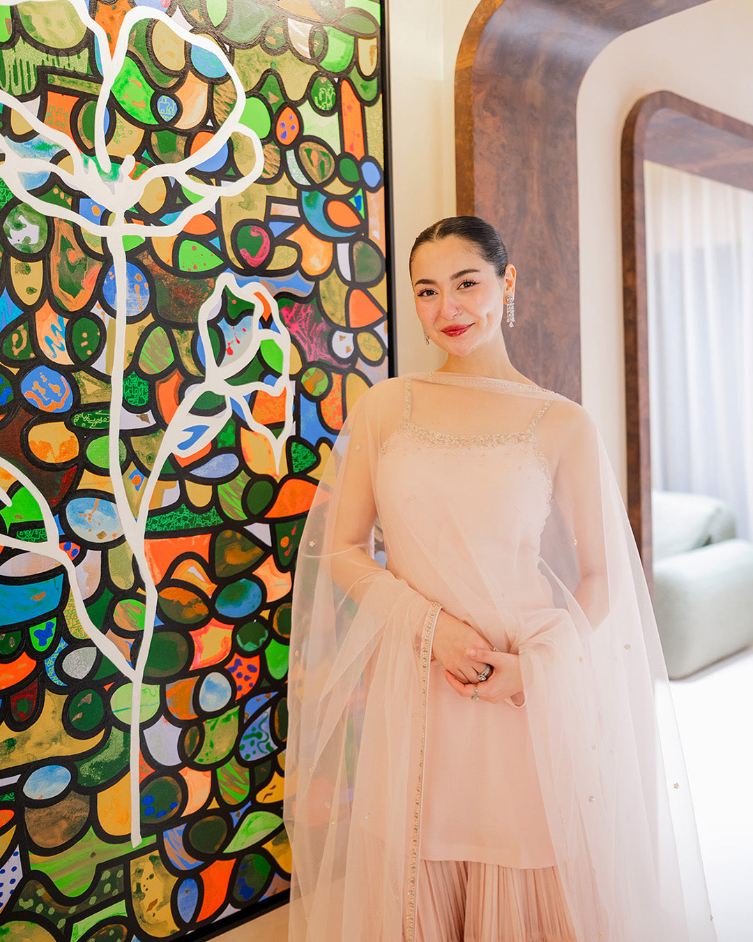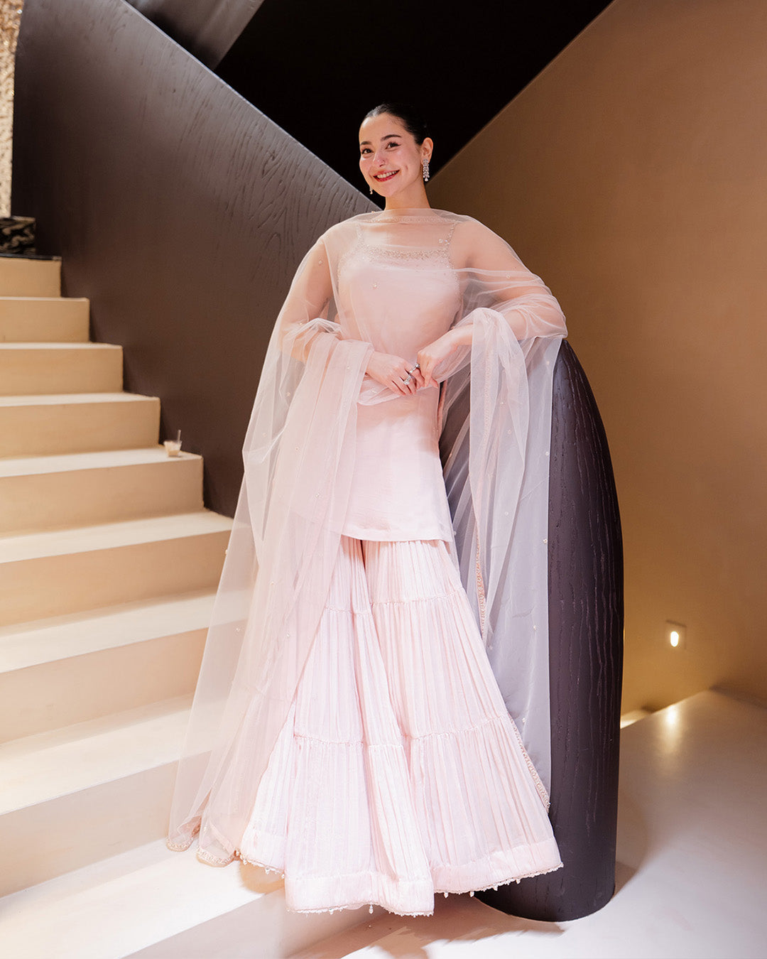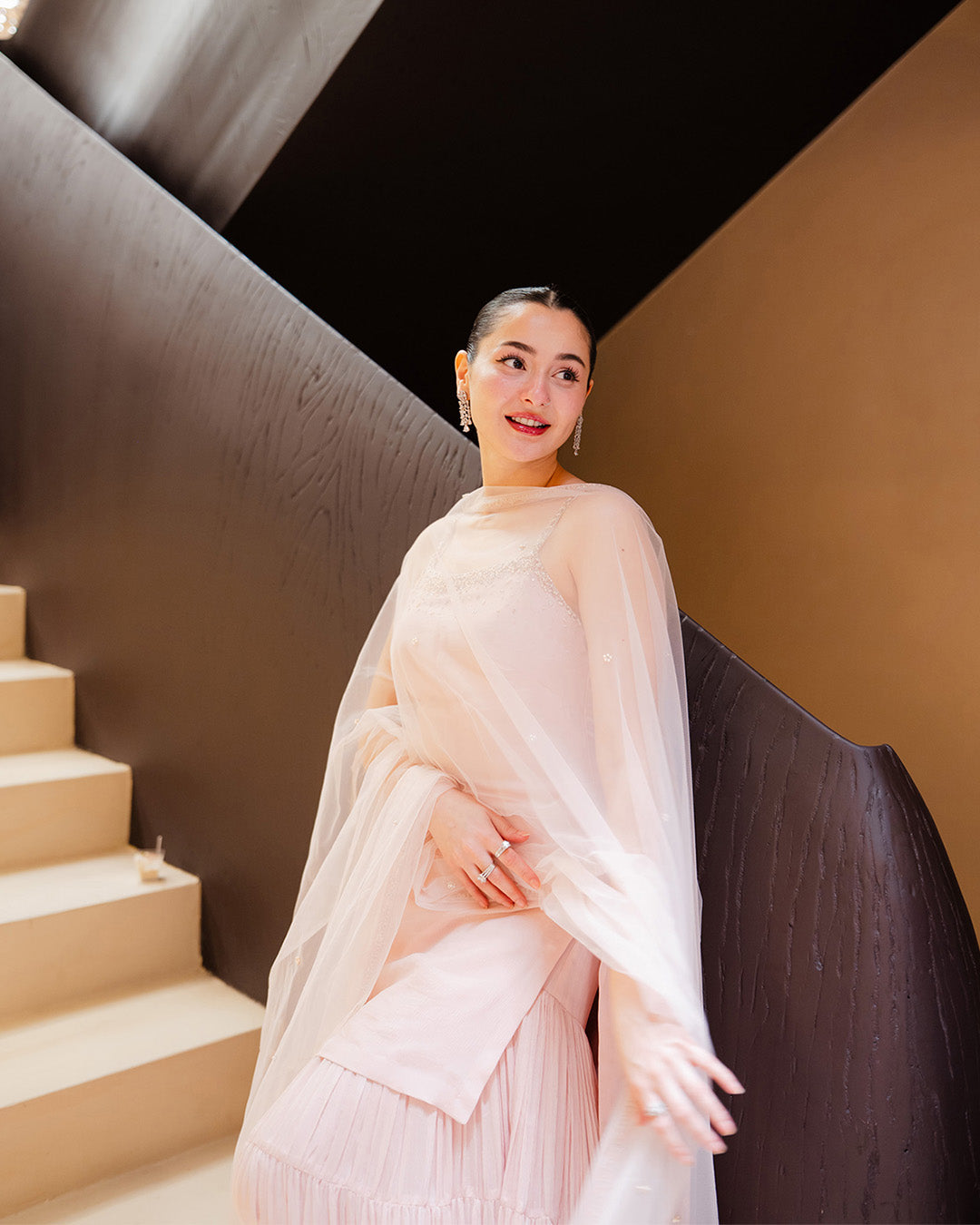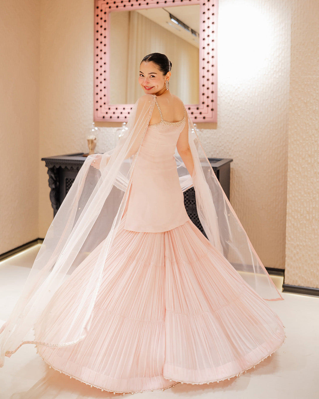 Exuding sophistication, Ailis encapsulates a timeless silhouette. Crafted on a seashell pink chiffon, the embellished shirt and voluminous gharara are perfectly complemented with a lavishly embellished net dupatta, making it a versatile piece you will cherish for years.