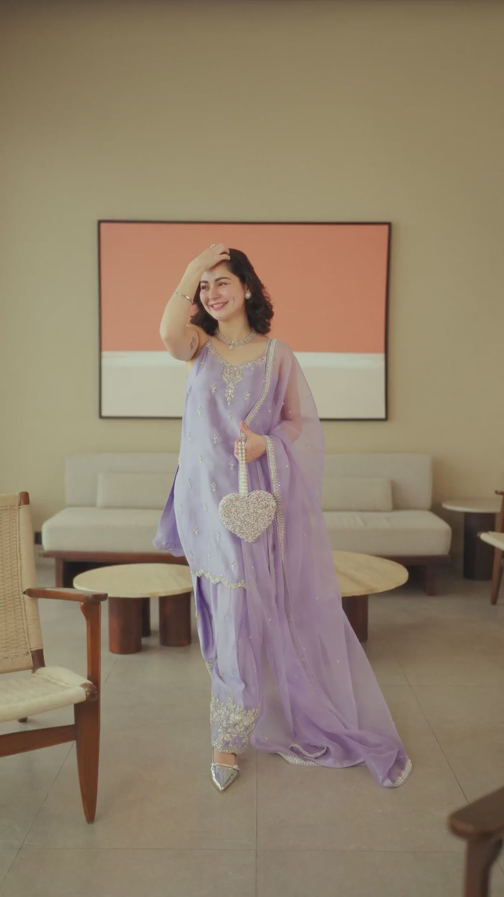 Irresistibly striking, Renee boasts of a striking silhouette. Crafted from lilac silk, the embellished shirt and shalwar feature shimmering naqshi, sequin and crystal work. Paired with an embellished organza dupatta, this piece is the ultimate show stopper.