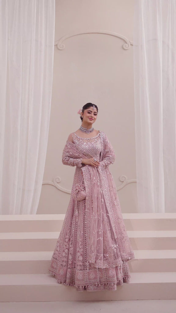 Radiating grandeur, Leyan makes a sublime statement. Rendered on dusty pink net, the shirt and lehenga set is lavishly adorned with intricately patterned embroideries, adding a touch of finesse. The ensemble is further elevated with a diaphanous net dupatta that creates an effortlessly graceful profile, evoking modern femininity with a whisper of timeless charm.