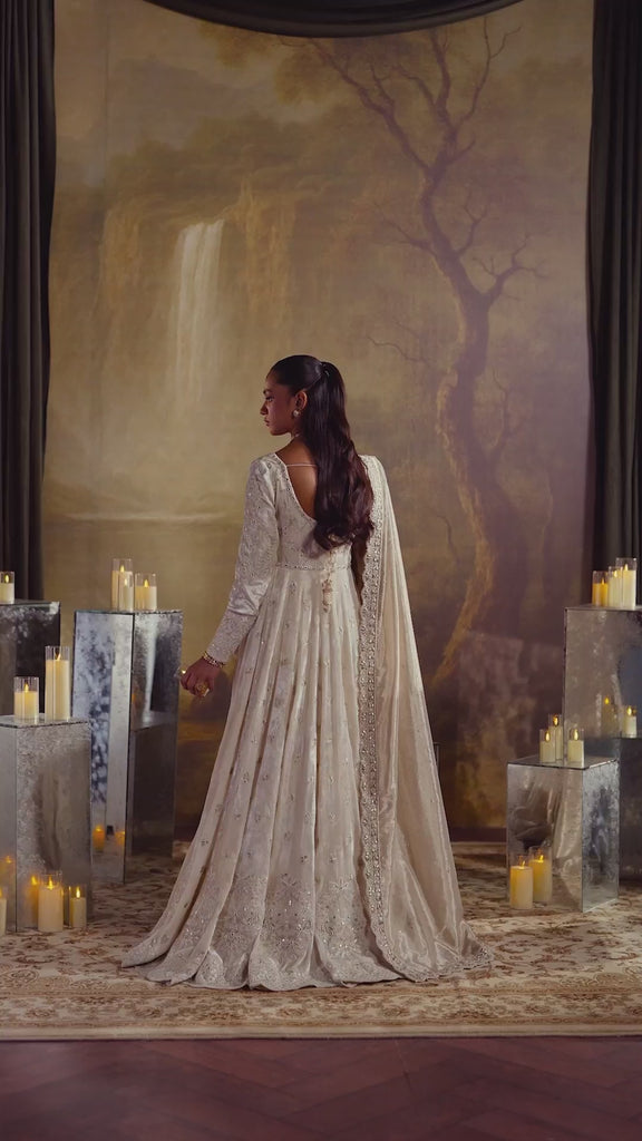 Harnessing old world regality, Catia is a resplendent ode to a classic silhouette. Crafted from off-white velvet, the pishwas features lavishly adorned motifs of tilla, resham and mirrorwork. Paired with a silk churidar and an embellished tissue dupatta, this set will add the perfect festive charm to all your special celebrations.