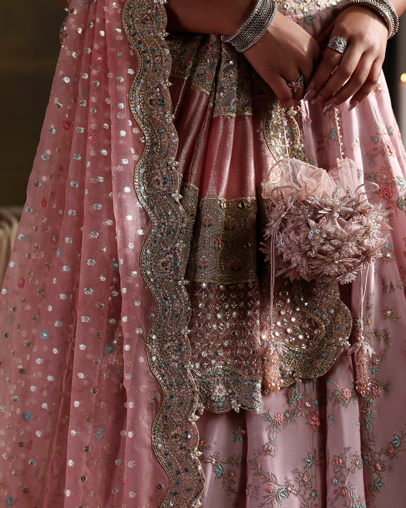 Evoking old world allure, Vanna stuns with its delicate ornamentation. Crafted on opulent dusty pink velvet, the choli features lavishly adorned resham, tilla and sequin motifs. The embellished silk printed lehnga lends the ensemble its statement silhouette. Paired with an embroidered organza dupatta, this set ensures you shine the brightest at every occasion.