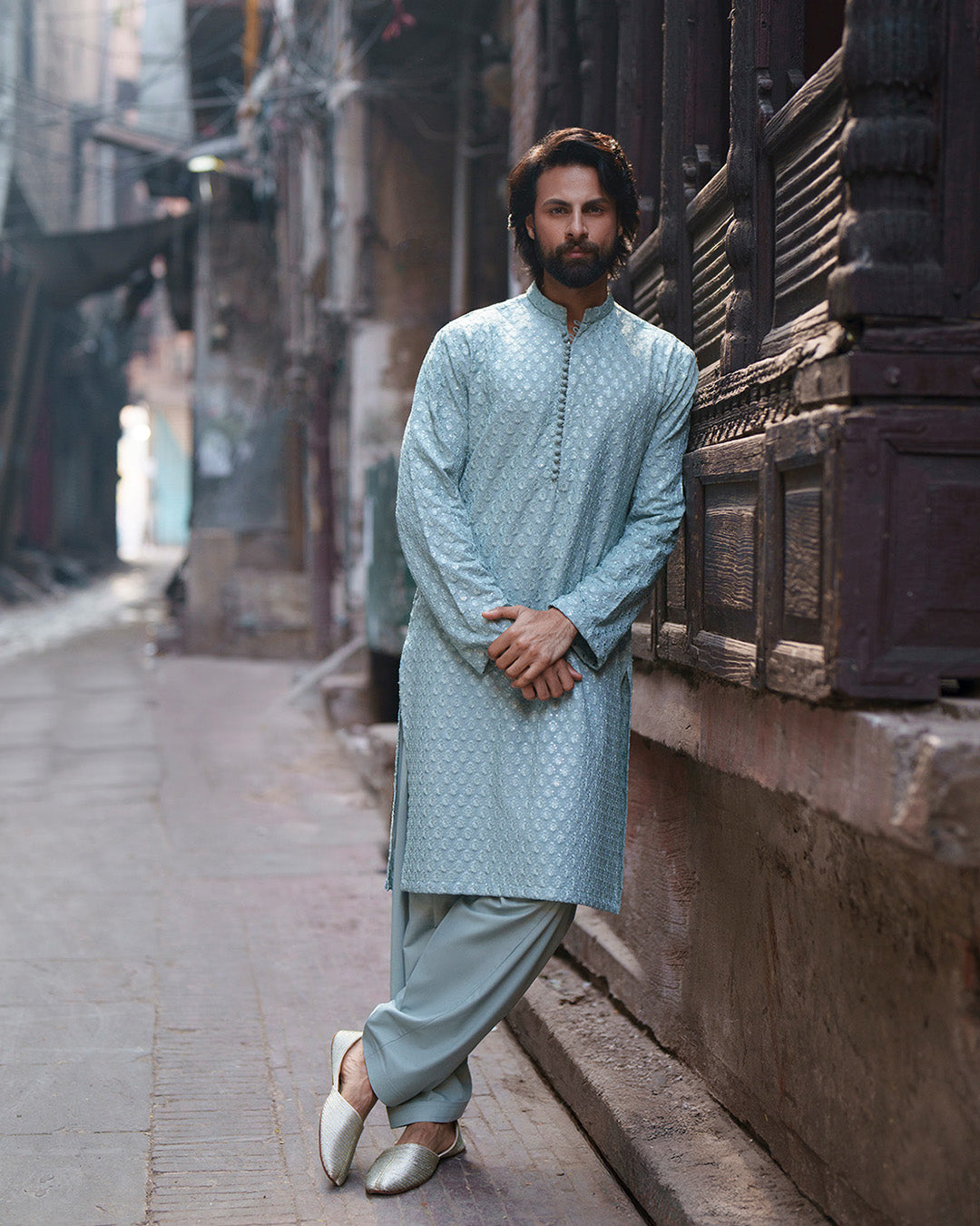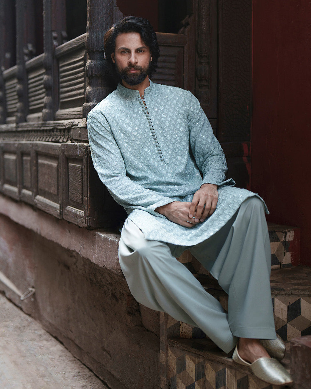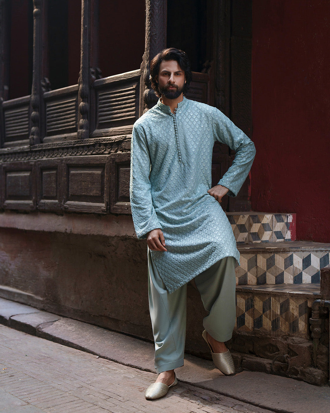 Celebrating heritage tailoring, Gezim offers a harmonious blend of tradition and comfort. The ice blue embroidered karandi kurta is paired with a coordinated karandi shalwar, creating a cohesive silhouette enriched with refined detailing. Ideal for your special festivities, this look captures effortless sophistication.