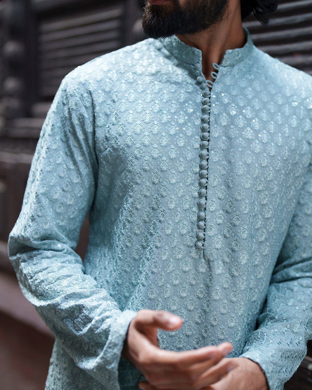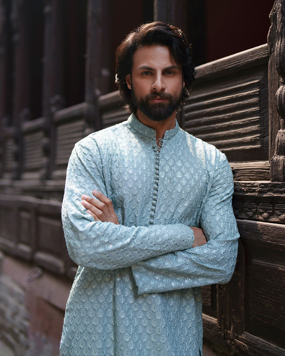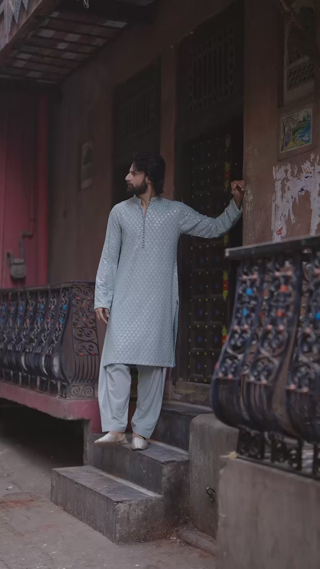 Celebrating heritage tailoring, Gezim offers a harmonious blend of tradition and comfort. The ice blue embroidered karandi kurta is paired with a coordinated karandi shalwar, creating a cohesive silhouette enriched with refined detailing. Ideal for your special festivities, this look captures effortless sophistication.