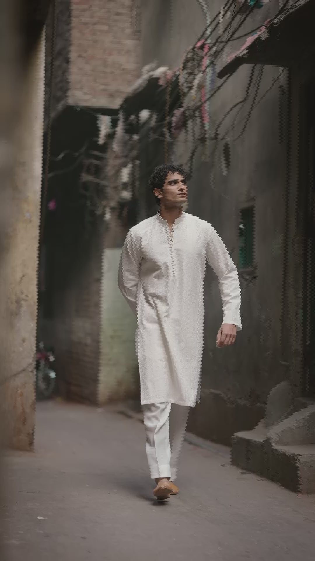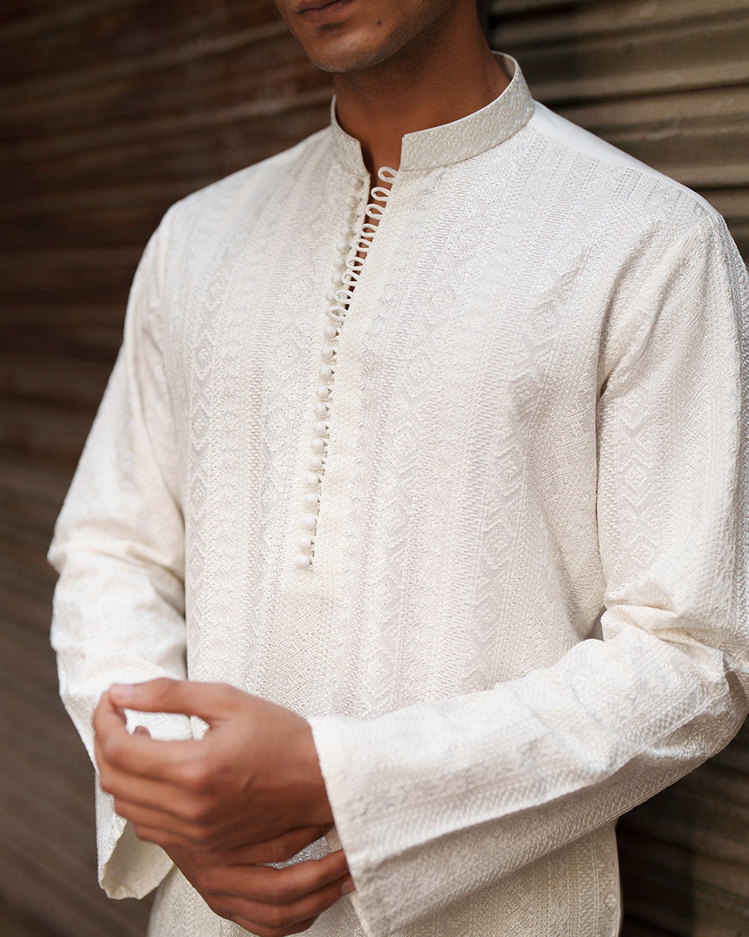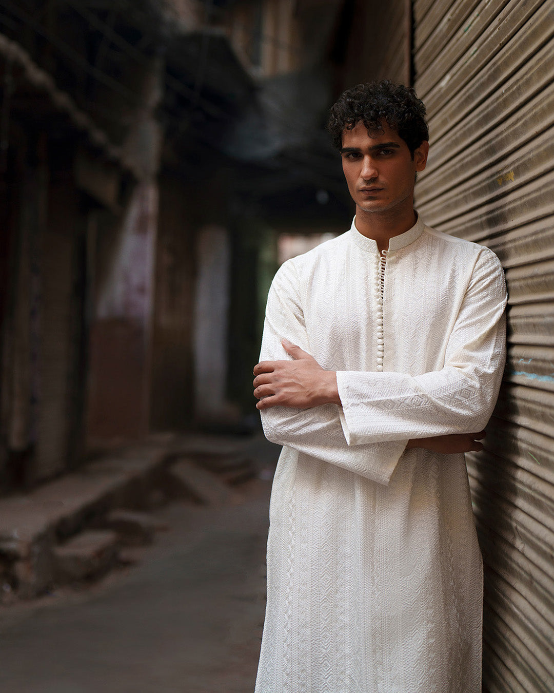 Minimal yet distinguished, Isuf elevates classic menswear through refined embroidery. The pure white embroidered kurta introduces subtle ornamentation while the matching trouser maintains clean structure and versatility. Designed for modern festivities, this ensemble balances elegance with relaxed confidence.