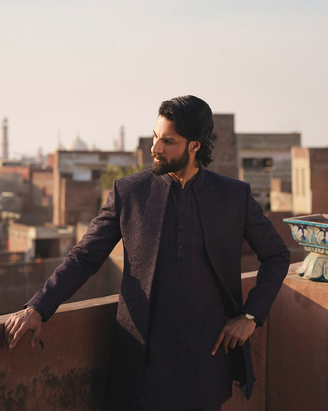 Exuding regal charm, Korab is crafted for grand festive moments. The deep brown, embroidered prince coat introduces statement craftsmanship, layered over an embroidered inner suit that enhances depth and richness. Striking and refined, this ensemble delivers commanding elegance for ceremonial wear.