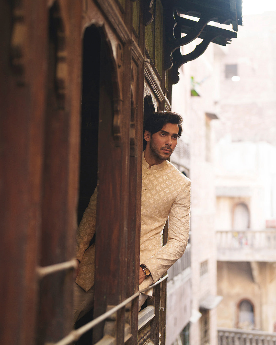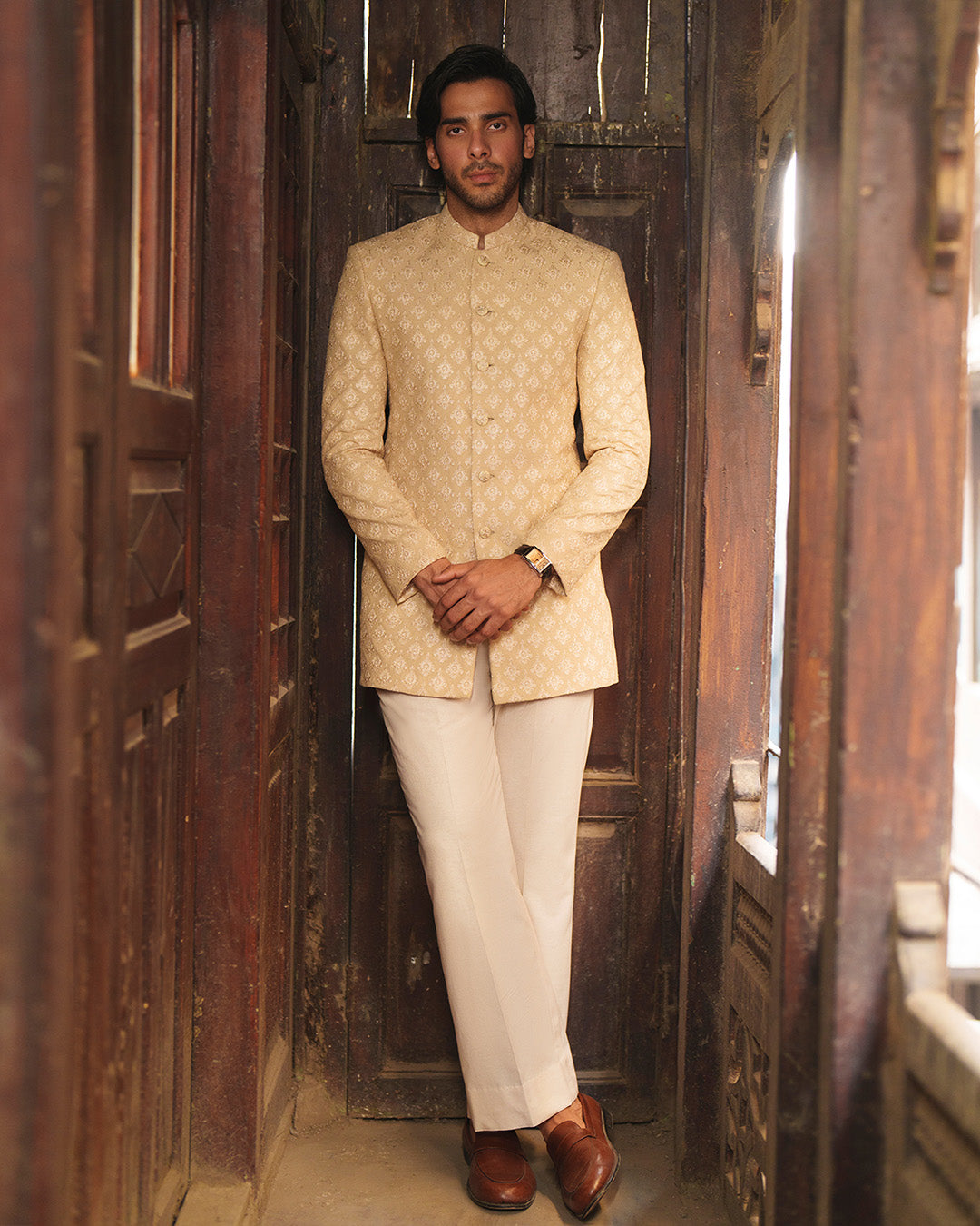 Bold yet sophisticated, Zemi reinterprets classic occasionwear through layered artistry. The ivory embroidered Karandi prince coat, enhanced with printed detailing, is paired with a refined Karandi inner suit to create a striking yet balanced silhouette. Perfect for festive evenings, this design reflects confident modern elegance.